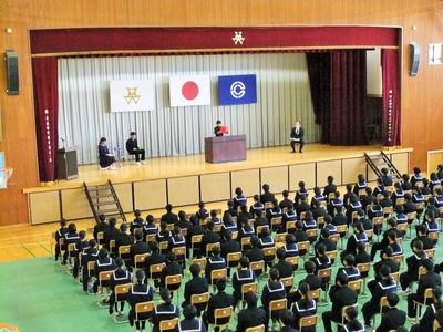 年明けの令和3年1月5日、例年より3日早く3学期の始業式を迎えました。その後、本校行事の特色の一つでもある立志式を行いました。この立志式は、春に中学校3学年となる14歳の2年生が、自らの将来を展望し、志を立て、次代の社会を担う者としての誇りや自覚を決意する場でもあります。そして、健全な心身をつくり、新たなスタートに立つ14歳の若人を祝い、励ます会でもあります。