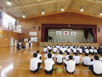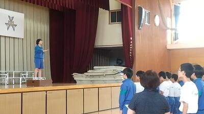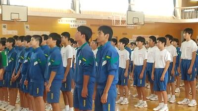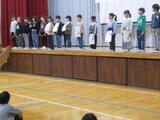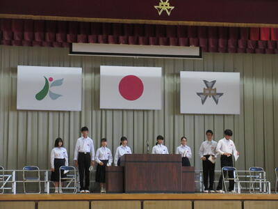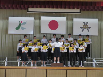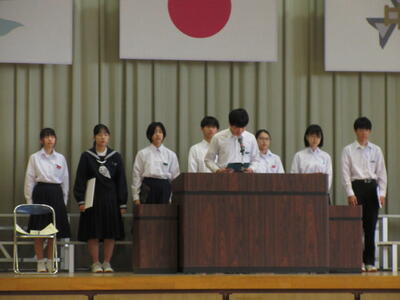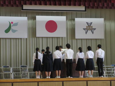 生徒朝会で、旧生徒会の解任式と新生徒会の任命式が行われました。これまで学校の中心となってきてくれた生徒会本部役員のみなさん、ありがとうございました。新生徒会本部役員のみなさん、これからの活躍を楽しみにしています。