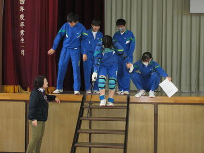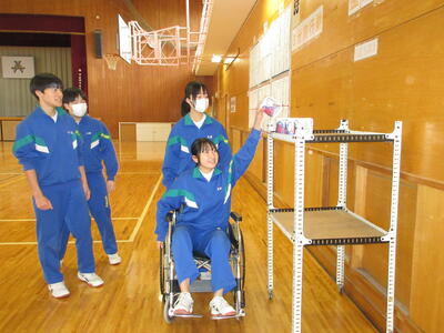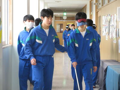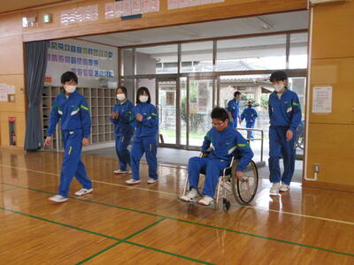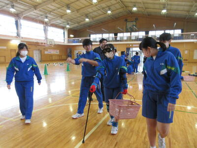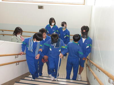 総合的な学習の時間に福祉体験を行いました。1組は高齢者体験、2組は車椅子体験、3組は白杖体験です。階段の上り下りをしたり、荷物を運んだり、ドアを開けたりなど、それぞれの立場にたって体験を行いました。いつもはできていることが難しいと感じた人が多かったようです。この後、ローテーションで全ての体験を行う予定です。この体験を今後に生かしていきましょう。