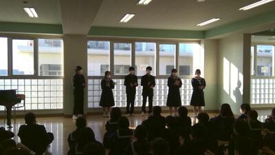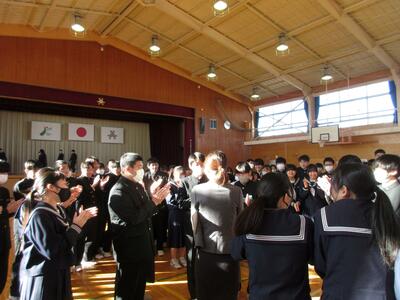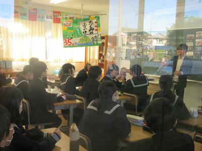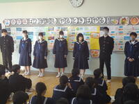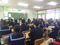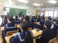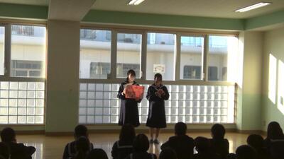 3学期から産休に入る先生にお礼の言葉を伝え、学年みんなの手紙を渡しました。入学以来、授業や委員会活動、行事、部活動などで大変お世話になりました。お体を大切に、元気な赤ちゃんを産んでください。