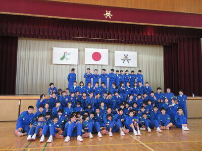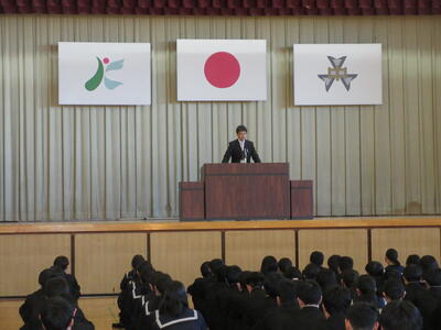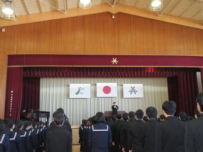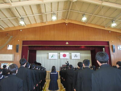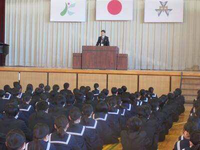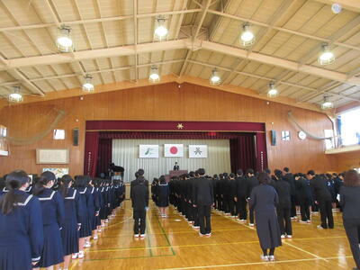 3学期終業式がありました。3学年代表生徒からは、「勉強や行事に充実した2学期だったこと、進路決定に向けていっそうの努力を重ねていきたい」という話がありました。校歌斉唱では、3年生らしい良い歌声が響いていまいsた。これから14日間の冬休みが始まります。体調に気をつけながら、自分の目標に向けて、努力を続けていきましょう。
