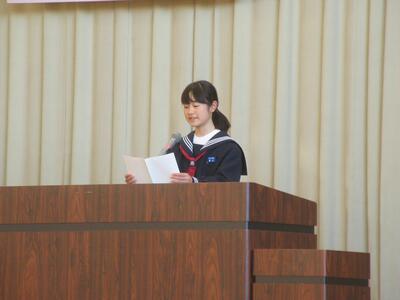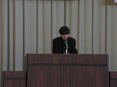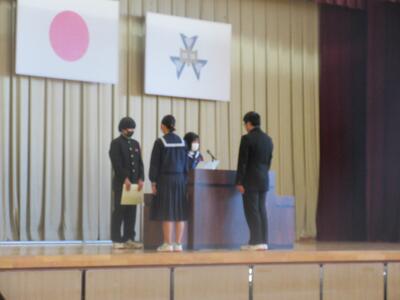 2学期を振り返って、各クラスの学級委員と専門委員会の各委員長から成果の報告とと今後の課題・対策についての発表がありました。また、冬休みの生活についての確認が行いました。各自も進級当初の目標を振り返りながら、今後の生活に気持ちを引き締めていたようです。