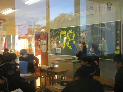 2学期が今日で終わります。吹香祭や音楽祭などさまざまな行事を通して、よりクラス・学年の絆が深まった学期でした。3学期入ったらすぐにスキー教室が控えています。更に最高の学年へと成長ができるように、いまからできる準備をしっかりしておきましょう。また風邪等も流行っています。約2週間ある冬休みを有意義なものにするためにも、まずは健康第一に過ごし、計画的に宿題等を進めましょう。1月8日(水)変わらず元気な姿の皆さんに会えるのを楽しみにしています。よいお年を!