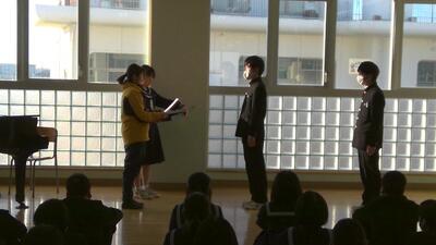 3学期初めの学年朝会がありました。はじめに、学級委員から今月の目標の発表があり、1月の誕生日をお祝いをしました。進路担当から入試に関する話があり、自学ノート10冊達成者の表彰が行われました。また、三年生を送る会で歌う合唱曲名の発表もありました。いよいよ卒業が近づいてきたなという気がします。