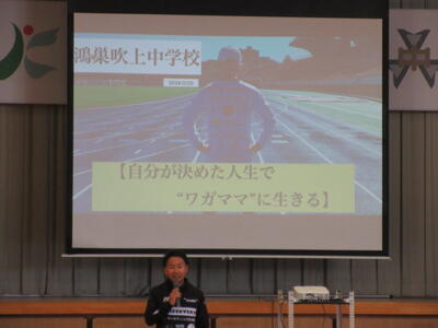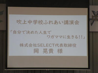 11月25日(月)にふれあい講演会がありました。今回は株式会社SELECT代表取締役岡晃貴様をお招きして、「自分で決めた人生でワガママに生きる!!」というテーマでお話していただきました。みんな真剣に話を聞いていました。特に3年生は進路を考える上で、とても参考になったと思います。岡様、お忙しい中、貴重なお話をありがとうございました。