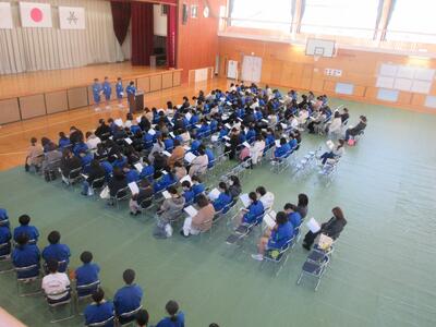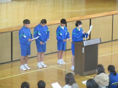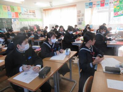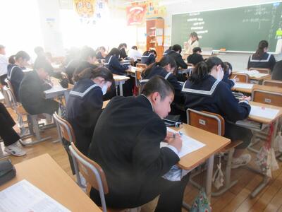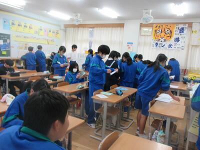 早いもので明日で12月の1週目が終わります。2学期も残り13日となりました。今日の学活では、2学期の振り返りを行いました。2学期当初に立てた目標は達成することができたでしょうか?吹香祭や音楽祭と行事が盛りだくさんの2学期。クラス・学年の絆もより深まったように思います。このままスキー教室へ向けて、更に絆を高めていきましょう。