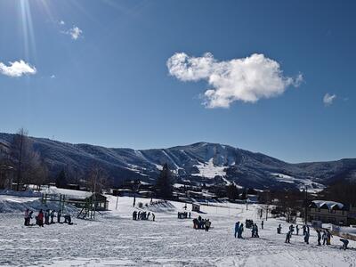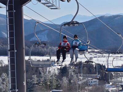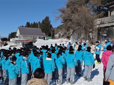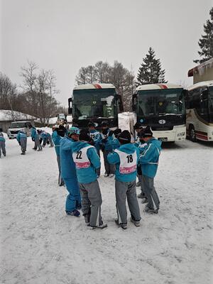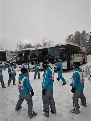 本日から1年生はスキー教室です。朝、7時45分に学校を出発した1年生は無事に菅平高原に到着しました。