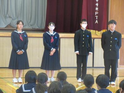小・中音楽交流会がありました。11月5日(火)に3年2組は小谷学校、3年3組は大芦小学校へ行きました。1組は11月8日(金)に吹上小学校へ行き、合唱を披露してきました。しっかりとした態度で参加することができました。小学生たちからたくさんの拍手をいただくことができました。一緒に「翼をください」を歌った学校もありました。良い交流会となりました。