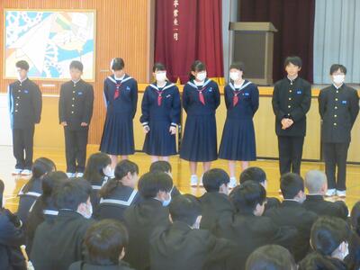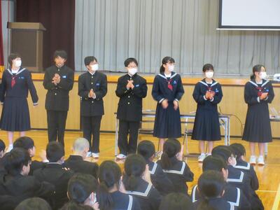 本日、学年朝会が行われました。後期学級委員の自己紹介や給食委員からの取り組み・反省の発表、スキー教室実行委員の紹介やスローガン発表が行われました。学級委員からは「時間を守ること」を意識しましょうと話がありました。中学1年生も折り返し地点を過ぎ、残り約5ヶ月となりました。慣れてきたからこそ、毎日の授業時間や給食・清掃などの時間をしっかり守る意識を学級委員だけではなく、学年全員がしっかり持ちましょう。1月に控えているスキー教室へ向けても、実行委員会が着実に取り組みを進めています。リーダーの思いを学年みんなで支えられるといいです。