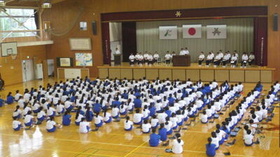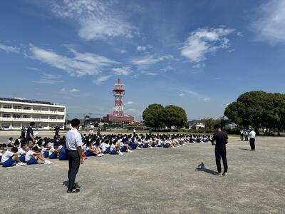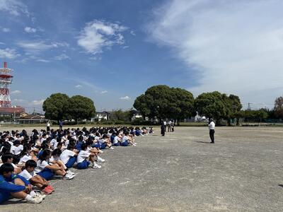 9月3日(水)に今年度2回目の避難訓練を行いました。今回は生徒に事前に訓練の時間は伝えずに行い、昼休みの時間帯に緊急地震速報を放送することで訓練を開始しました。火災場所を調理室と仮定して全校生徒が危険を避け、校庭に避難することができました。そして、緊急時の生徒一人一人の「集団下校」か「引き取り」の確認を行いました。校長先生からは、集団下校中等で安全な場所へ移動できずに困っている人に出会うこともあるかもしれない、自分の身を守るとともに中学生ともなると他の方を助けるような場面も想定できるようにと指導講評がありました。