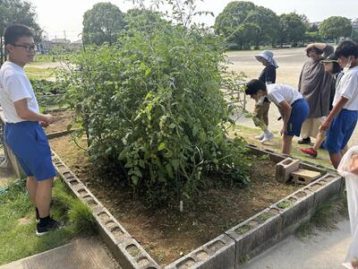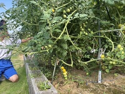 現在、あすなろ学級では4月に植えたミニトマトの収穫が始まっています。4月に植えた4本の苗が今ではこんなに大きくなりました。赤・黄色・オレンジ・茶色の実がなる、4種類のミニトマト、味見をさせてもらいましたが、どれもとてもおいしかったです。