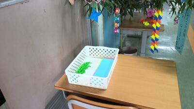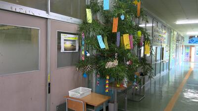 本日は7月7日、七夕、あすなろ学級では特別支援教育指導員の先生が七夕飾りのための笹を持ってきてくださり、短冊や飾りを付け、廊下に展示しました。
