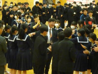 本日、離任式が行われ、昨年度までお世話になった先生方と最後の対面を行いました。全体の式後には、旧2学年で特にお世話になった先生をお招きして、学年だけの離任式を生徒の企画で実施しました。先生の授業を再現してその思い出を共有し、合唱「遥か」で盛大な見送りとなりました。3年生となった赤学年のパワフルさと暖かさで包まれた、とても良い時間になりました。
