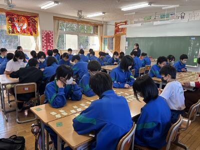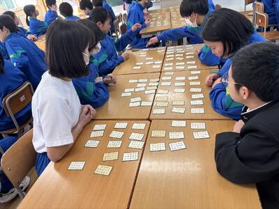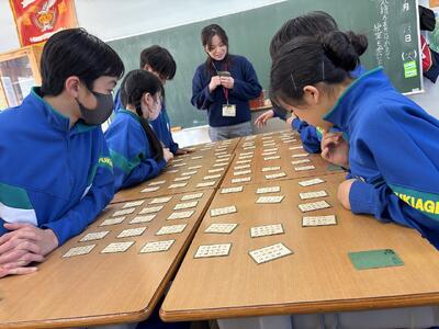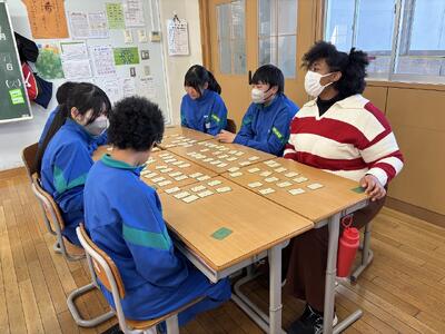 1年生国語の授業の風景より(1月13日) 投稿: 吹上中学校 (13:46) 本日の第2校時、1年1組の教室からわいわいと生徒たちの声が聞こえてきたのでのぞいてみると、国語の授業で百人一首を行い、大変盛り上がっていました。ALTのリアン先生も加わり、生徒たちは意欲的に、楽しく活動を行っていました。職員室に戻ってきたリアン先生は「12枚ゲットできた!!」と大変喜んでいました。 -