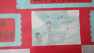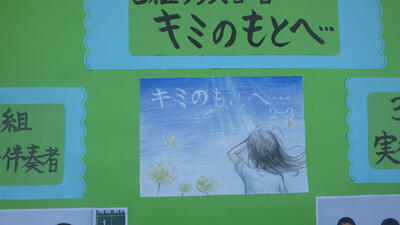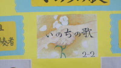 各クラスの教室の廊下には音楽祭のクラス合唱曲のイメージ画が掲示されています。2年生の各クラスのイメージ画を紹介します。どれも心のこもった力作です。
