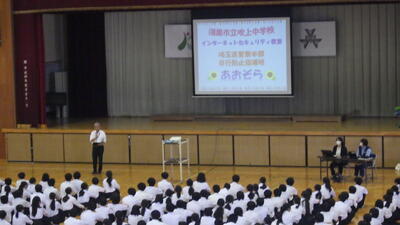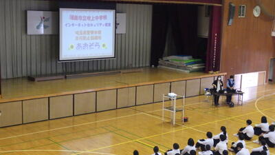 10月10日(金)中間テスト1日目3時間の後の4校時にSNS利用教室(非行防止教室)を行いました。講師には埼玉県警察非行防止指導班「あおぞら」のお二人をお迎えしました。講義では、中学生がSNSを利用する際の注意点、個人情報・プライバシーの漏洩、いじめ・炎上、著作権侵害、スマホ依存、知らない人からのトラブル防止すること等、多くの事を学びました。